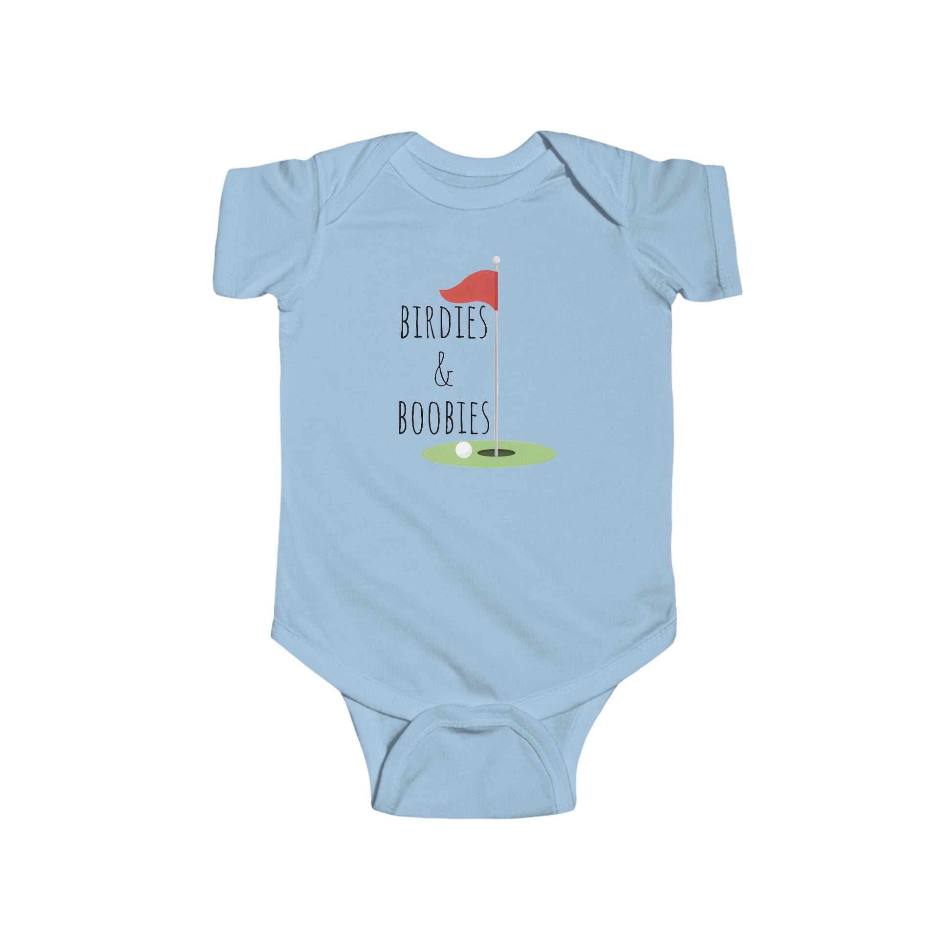 Birdies & Boobies on a 100% cotton onesie. Seams along the sides, ribbed knitting at the bindings, and plastic snap closures for easy changing.