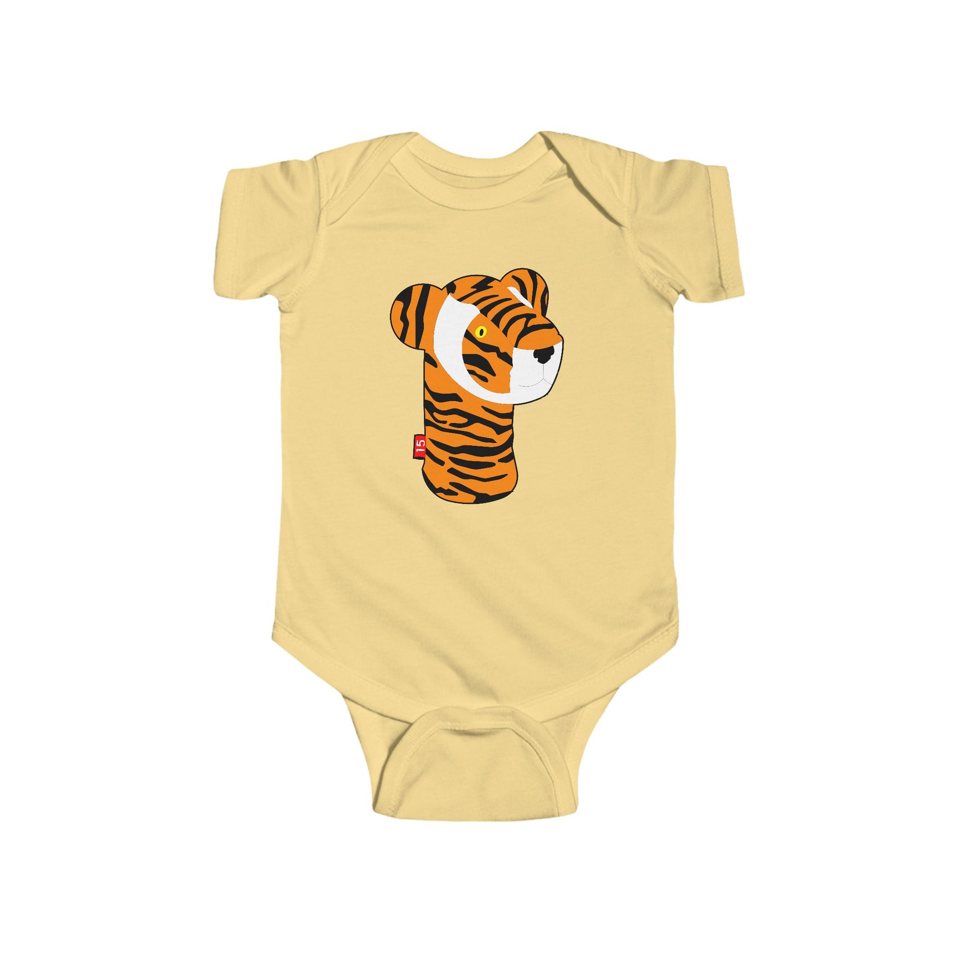 100% cotton onesie with the legendary Frank headcover design with the 15 tag for Tiger's 15 majors. Seams along the sides, ribbed knitting at the bindings, and plastic snap closures for easy changing.